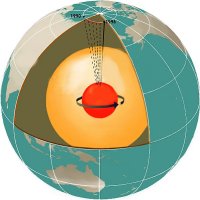 The Earth's center consists of a solid iron core which has a radius of about 1220 km (738 miles). Outside this core is a fluid layer composed mostly of molten iron and nickel. The outer core is about 2260 km (1400 miles) across. The inner core is very hot and dense and pushes heat to the outer core. As the Earth spins it creates turbulence in the outer core and the swirling liquid metal creates an electric current hundreds of miles wide.This current in turn creates the Earth’s magnetic field.